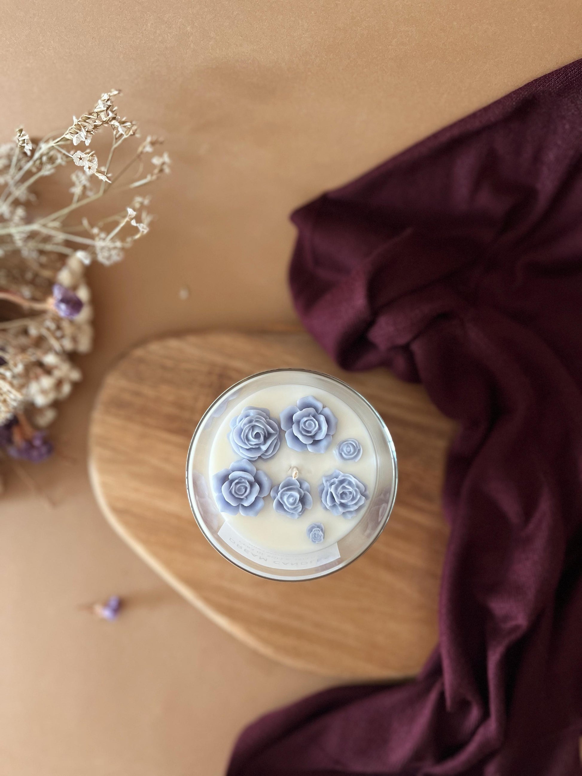 Decorada com delicadas flores lilás em relevo, cada vela é uma verdadeira obra de arte que perfuma e embeleza qualquer ambiente.