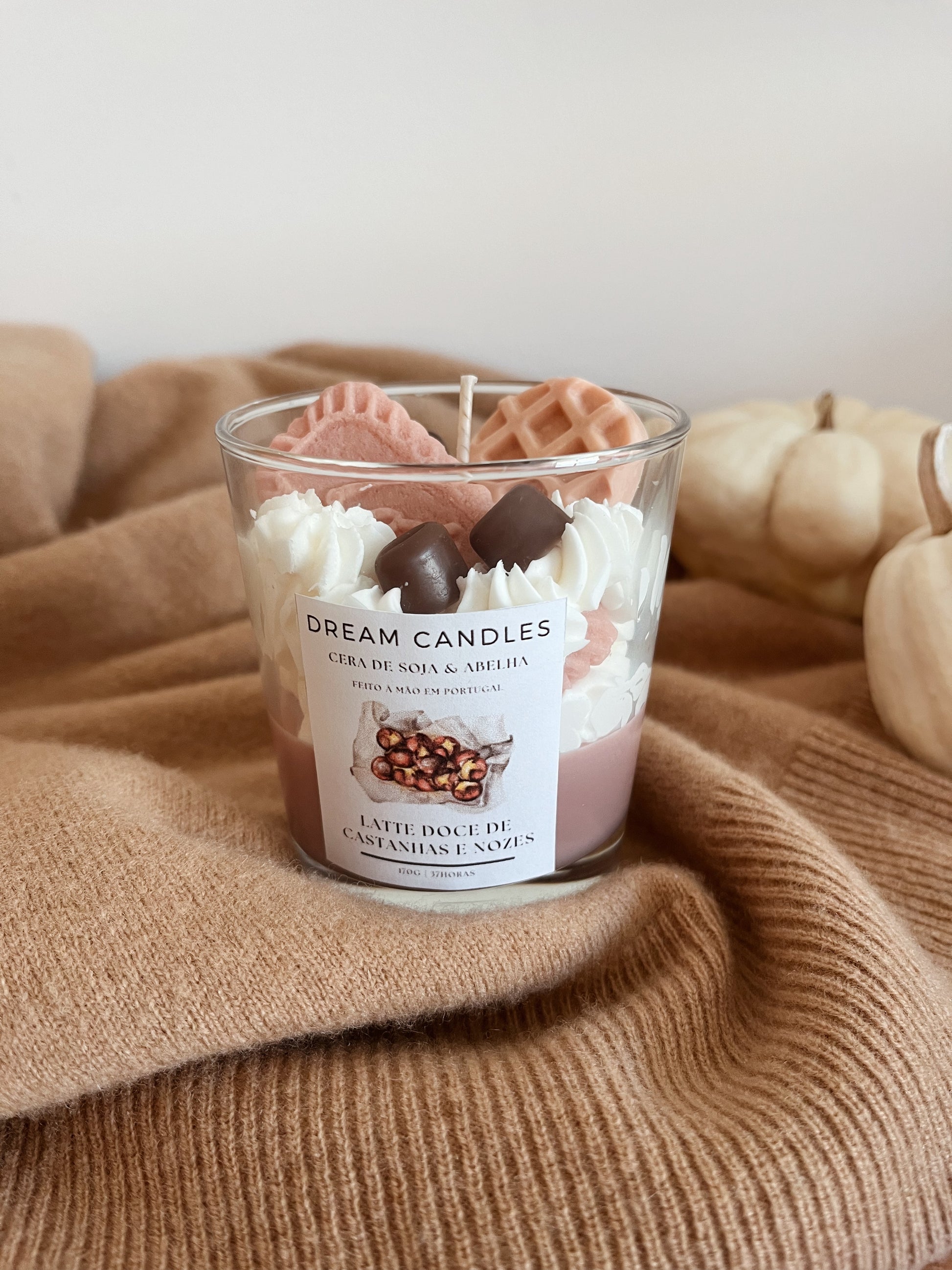 Experimente o aroma intenso de um doce latte com a nossa vela de cera de soja Latte doce de Castanhas e Nozes, decorada com adoráveis biscoitos e grãos de café em cera. É a vela ideal para ofereceres como presente!